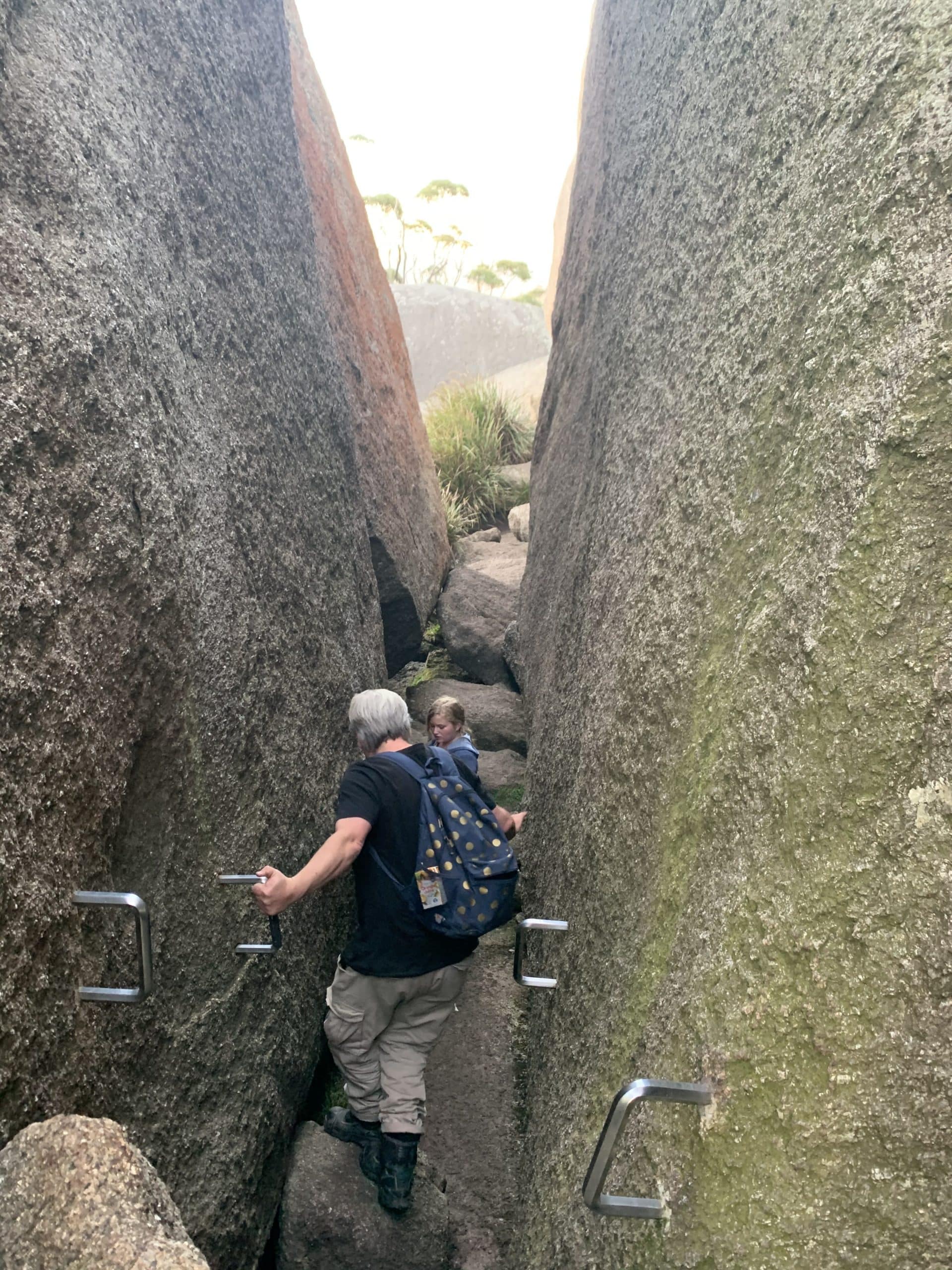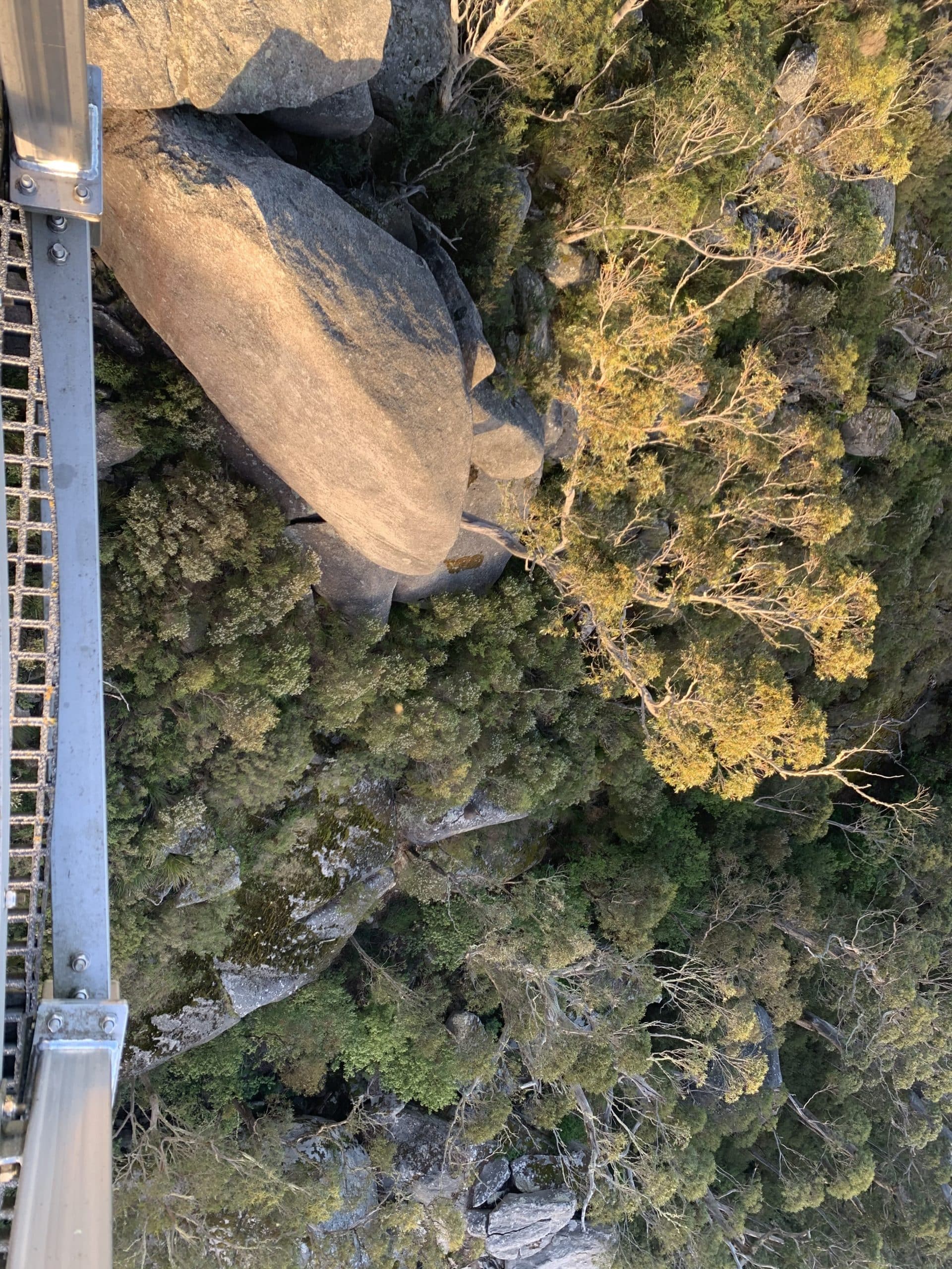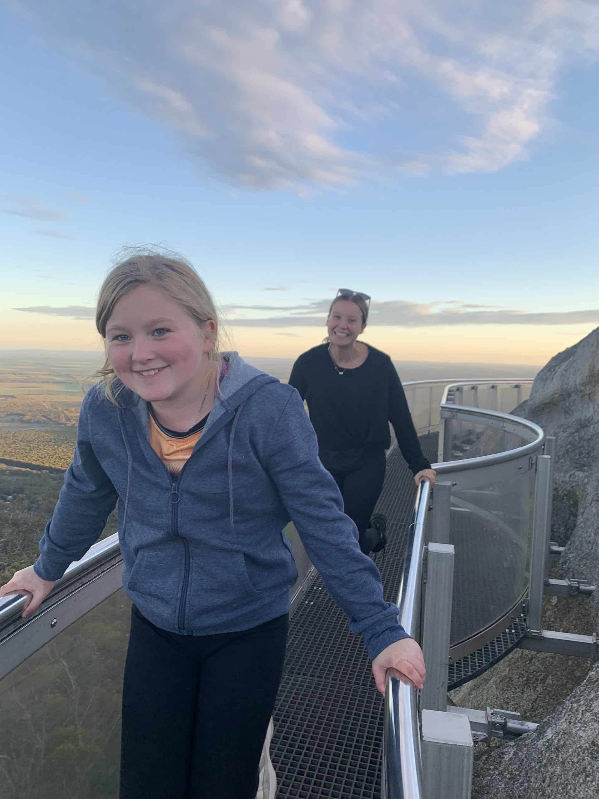 Following the track around a bit further, you come to a narrow walkway between two towering boulders. After a hop, skip and a jump (literally) over the rocks you climb out onto a flat granite boulder. The views from this platform were insane! As was the drop if you looked over the edge. This was the checkpoint before the end. The final obstacle was attached to the boulder in front of us. A 20 rung ladder straight up. My cousin had apparently never made it past this point before so we were determined to overcome the hurdle this time. Paul went for it. Straight up, no worries. Millie followed pretty confidently. I brought up the rear with my humongous drone backpack on my back which hardly fit in the surrounding cage. I feigned confidence right to the top and it wasn’t until my uncle said, “that was actually pretty scary wasn’t it”, that I showed how much my hands were shaking. We’d reached the skywalk. And boy was it worth it!